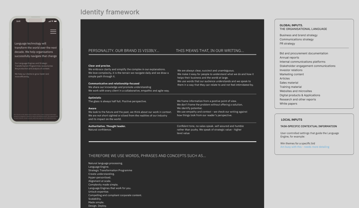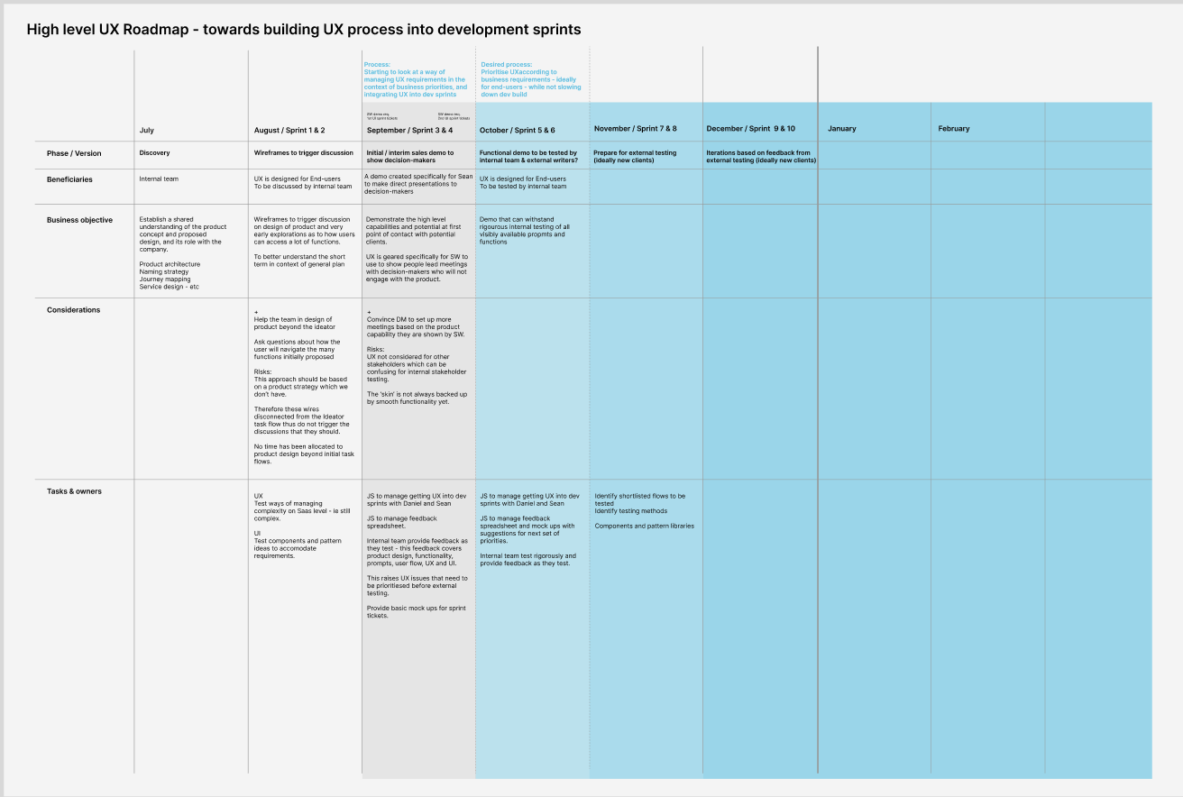 I set up the design strategy framework to define, detail and map user stories and journeys across setup, content generation, editing and save / store, and set the roadmap for the demo and initial phases working directly with the CTO.